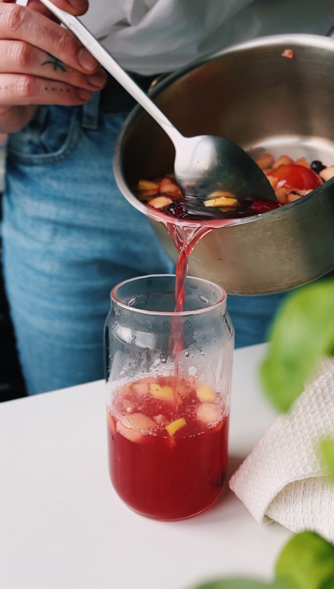 - Влить вино в кастрюлю, добавить специи, мед и фрукты.